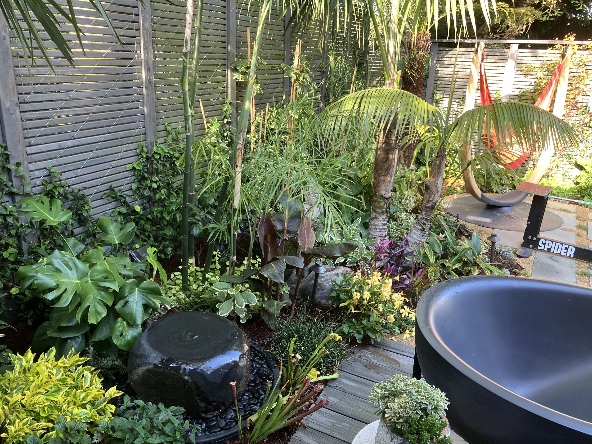 Our Mature Tree ferns, Kentia palms, striped timber bamboo and European fan palms were sourced to create an immediate tropical effect. They were also needed for highly practical purposes. Those strong San Franciscan winds blew straight through the garden every day and especially in early afternoon , thus confounding our intentions to design a warm inviting space. We mitigated this by planting wind-tolerant palms and the false frangipani tree (Hymenosporum Flavum) to create a natural and effective windbreak.
